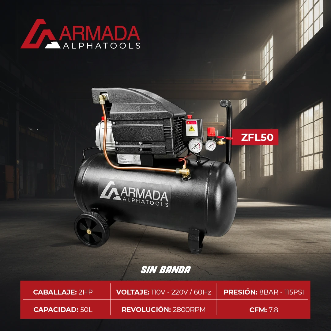 Es una máquina que genera aire comprimido usando energía eléctrica, y lo almacena en un tanque para alimentar herramientas pequeñas, infladores o sistemas de limpieza. El modelo de 2 caballos de fuerza (2HP) de ARMADA es compacto, eficiente y fácil de usar, ideal para trabajos domésticos, talleres pequeños o tareas de mantenimiento liviano.