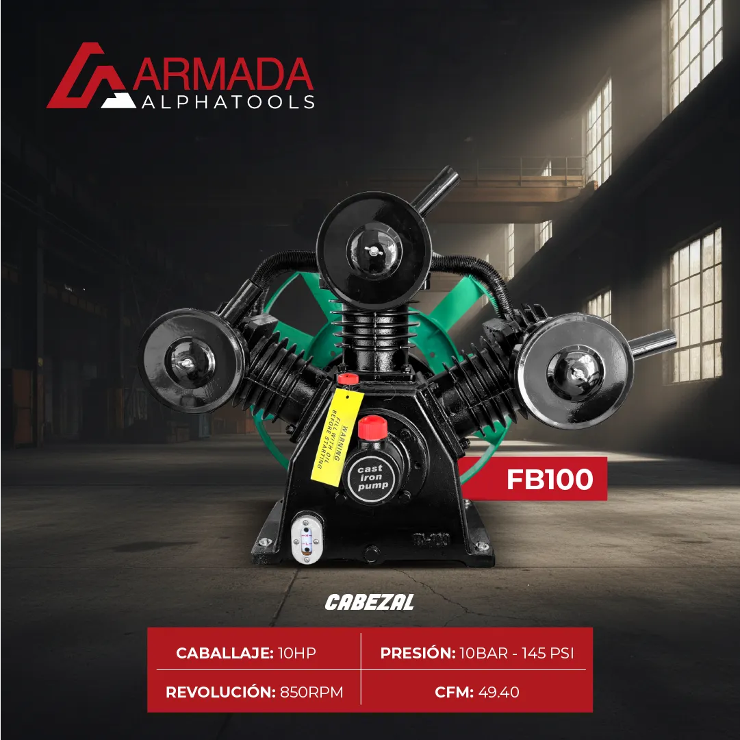 El cabezal compresor ARMADA FB100 de 10HP está diseñado para trabajos industriales que requieren alto caudal de aire continuo. Su operación a 850 RPM garantiza menor desgaste, mayor durabilidad y un rendimiento eficiente en aplicaciones exigentes.