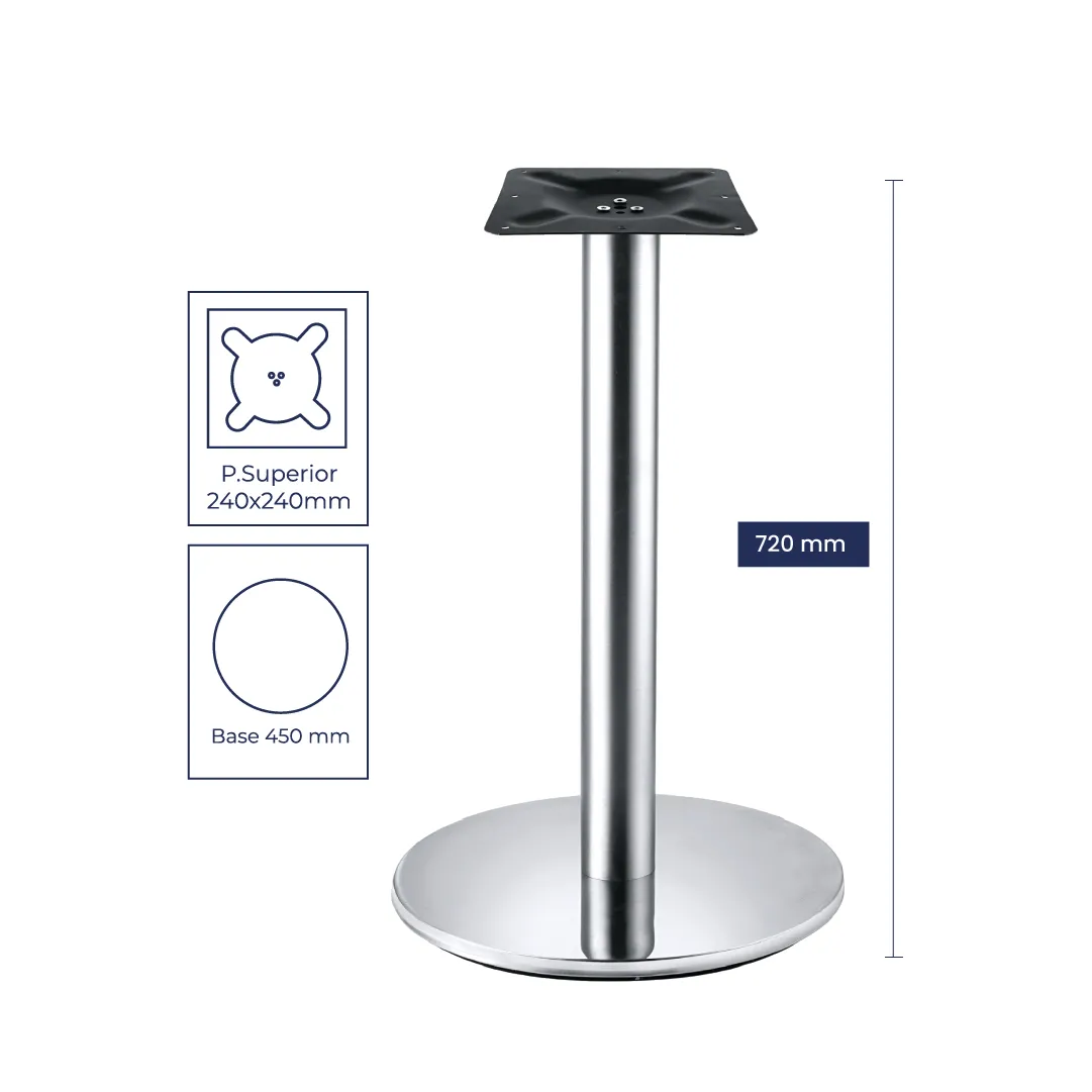 La Base de Bar YY-A001 de NELSON está diseñada para ofrecer elegancia, resistencia y funcionalidad en un solo producto. Fabricada en acero con acabado satinado (SN), su diseño redondo de 45 cm de diámetro y altura de 72 cm la hace ideal para bares, cafeterías, terrazas cubiertas y espacios de atención moderna. Su estética neutra y profesional encaja en ambientes contemporáneos o minimalistas.