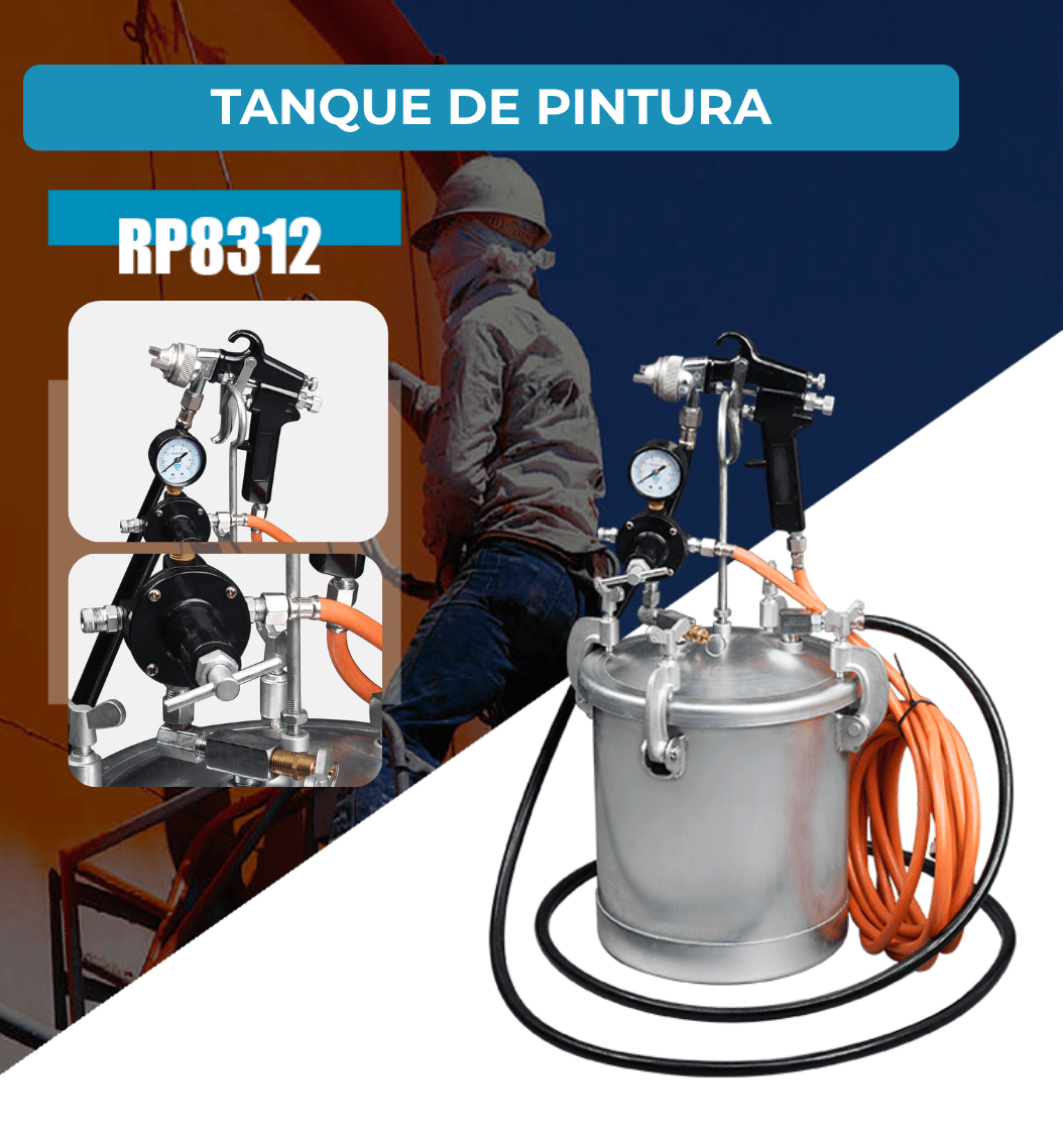 El Tanque de Pintura RP8312 es un equipo de alimentación a presión de alta capacidad (10 L), diseñado para aplicaciones continuas de pintura y recubrimientos industriales. Ideal para superficies amplias, viscosidades altas y trabajos que requieren precisión, potencia y autonomía sin recargas frecuentes.
